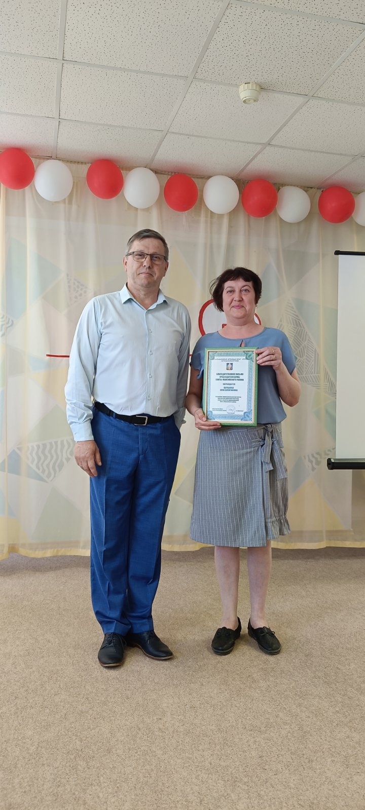 Виталий Еленчук поздравил и вручил Благодарственное письмо председателя Думы района за высокое профессиональное мастерство, многолетний добросовестный труд, вклад в развитие здравоохранения Ханты-Мансийского района Щербаковой Анне Валентиновне.