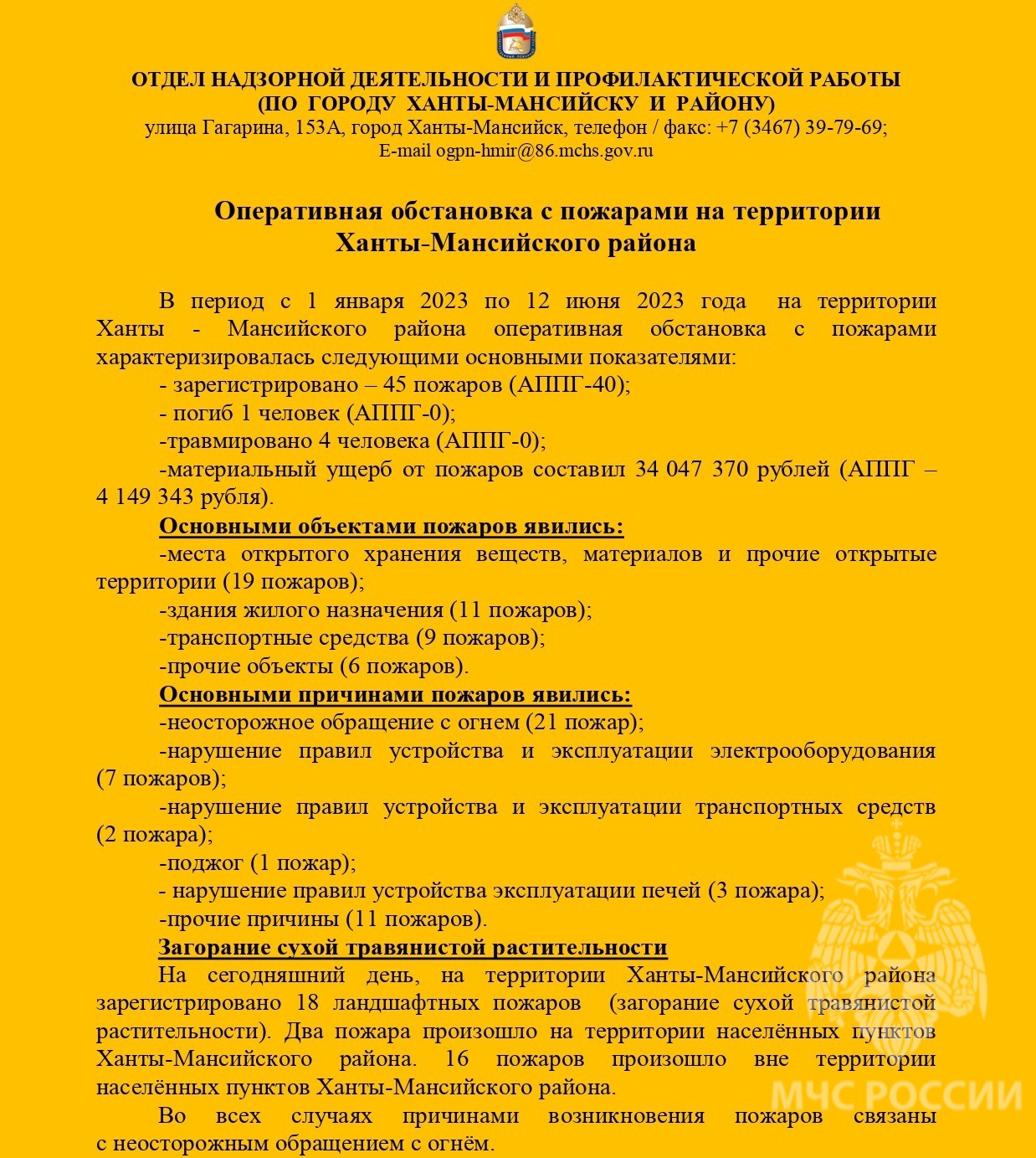 Оперативная обстановка с пожарами на территории Ханты-Мансийского района в период с 1 января 2023 г. по 12 июня 2023 г.