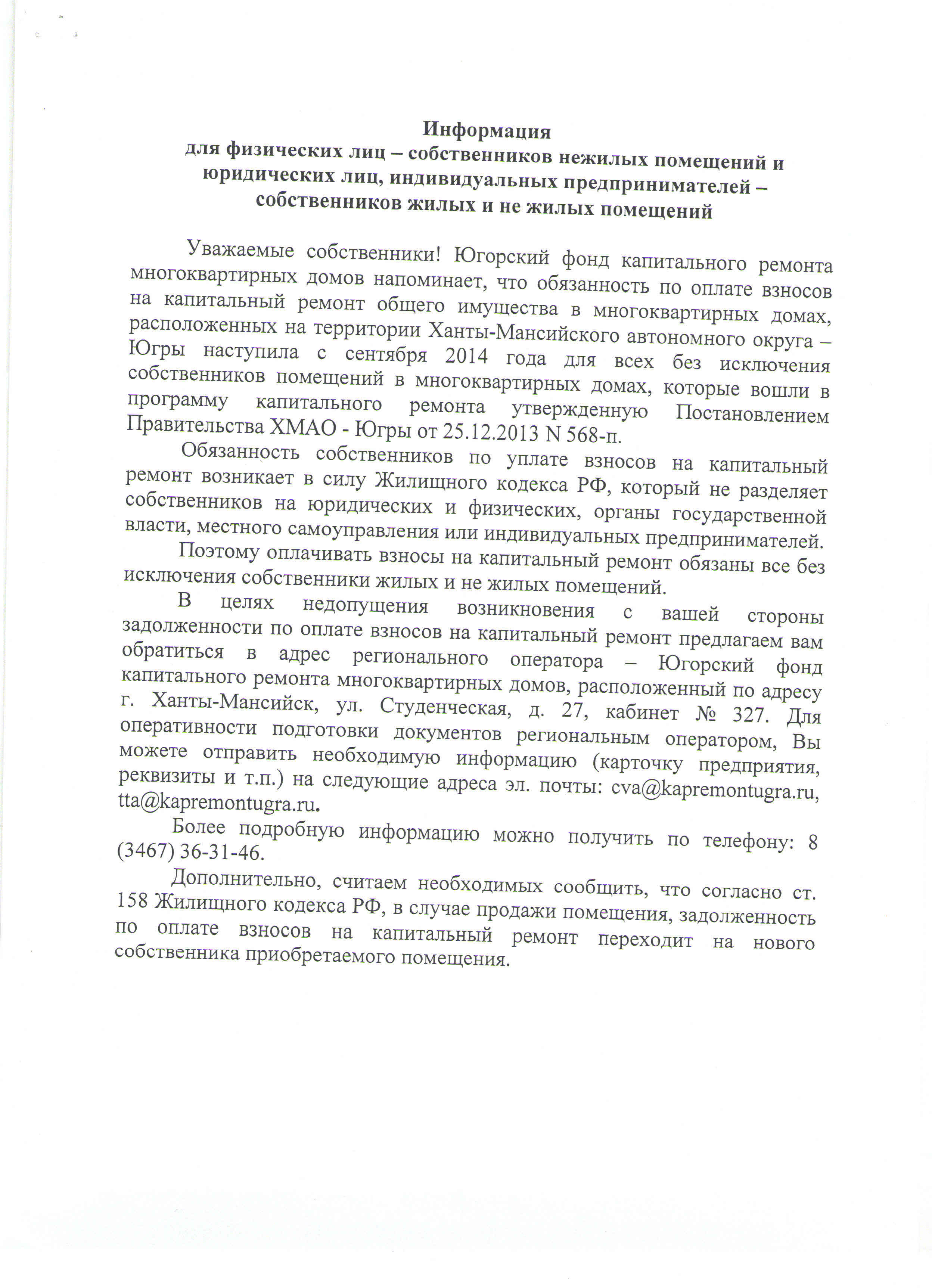 Информация для физических лиц - собственников нежилых помещений и юридических лиц, индивидуальных предпринимателей - собственников жилых и не жилых помещений